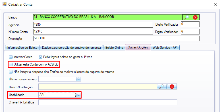 Na aba Outras Opções confira se a opção "Utilizar esta Conta com o ACBrLib" esta marcada (é obrigatório utilizar essa opção nos casos de homologação de boletos via remessa).