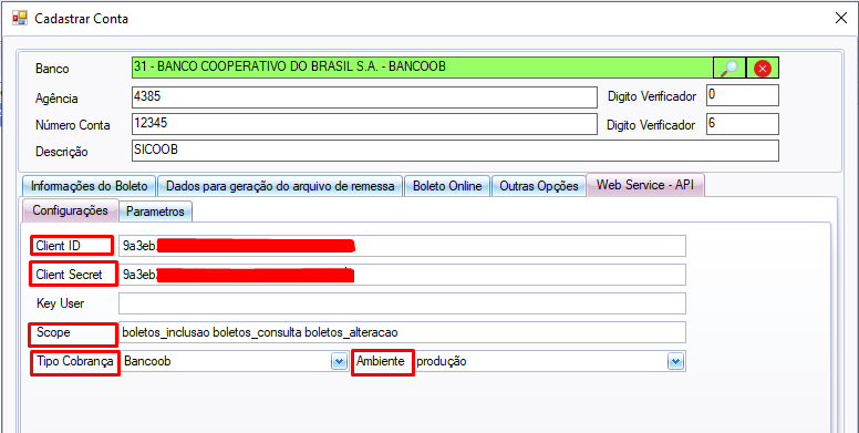 Agora com o Client ID copiado no portal da API, volte no cadastro da conta bancária no sistema e insira a Client ID nos campos "Client ID" e "Client Secret":