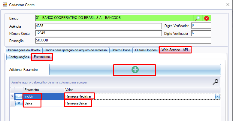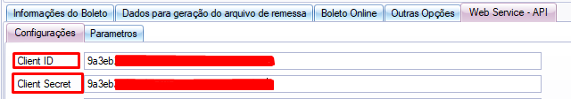 Ainda dentro da aba Web Service - API você pode configurar os parâmetros para Registro e Baixa dos boletos conforme imagem abaixo: