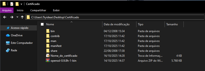 - Baixe o arquivo Openssl, salve na mesma pasta do certificado e extraia os arquivos;