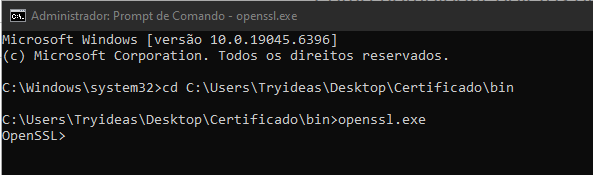 - Navegue até a pasta "bin" que estará salva junto na pasta onde foi salvo o certificado digital e execute o Openssl (para isso depois de chegar até na pasta bin digite "openssl.exe" e tecle enter);
