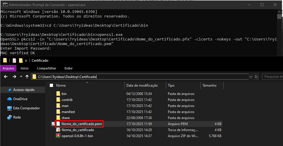 - Digite o comando para extrair a chave pública: pkcs12 -in "C:\Users\Tryideas\Desktop\Certificado\Nome_do_certificado.pfx" -clcerts -nokeys -out "C:\Users\Tryideas\Desktop\Certificado\Nome_do_certificado.pem" (substitua as informações que estão entre aspas pelo caminho/nome do seu certificado) e tecle enter e então digite a senha do certificado digital (essa senha não vai aparecer visível no prompt de comando), tecle enter novamente, se a senha estiver correta vai ficar dessa forma o comando e na pasta vai estar salvo o arquivo .pem: