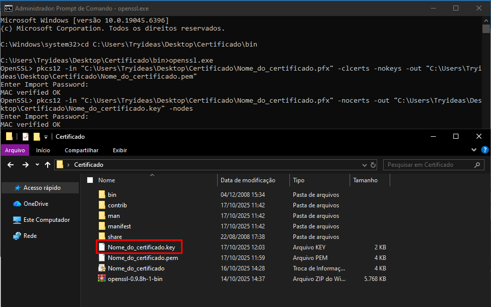 - Agora digite o comando para extrair a chave privada: pkcs12 -in "C:\Users\Tryideas\Desktop\Certificado\Nome_do_certificado.pfx" -nocerts -out "C:\Users\Tryideas\Desktop\Certificado\Nome_do_certificado.key" -nodes (substitua as informações que estão entre aspas pelo caminho/nome do seu certificado) e tecle enter e então digite a senha do certificado digital, tecle enter novamente, a senha estando correta na pasta vai estar salvo o arquivo .key: