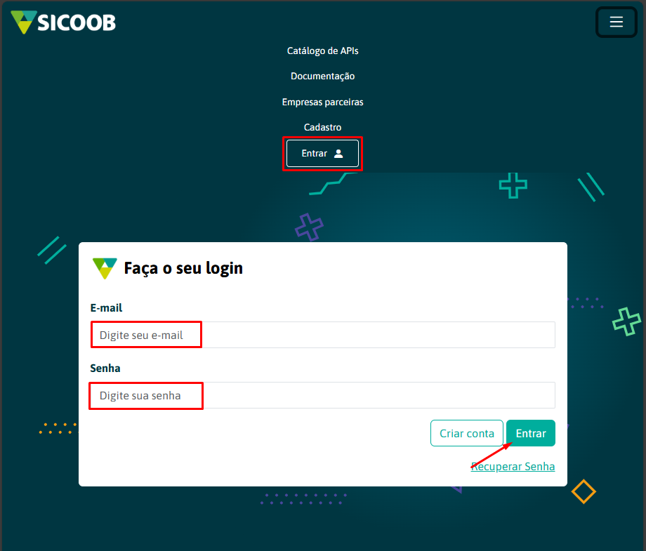 Acesso o site Portal Developers - Sicoob e clique na opção Entrar no canto superior direito do site e digite o login e senha do desenvolvedor: