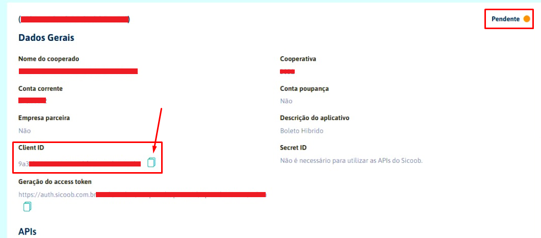 Acesse o aplicativo cadastrado para o cliente e copie o Client ID. Você vai perceber que o cadastro vai aparecer como Pendente: