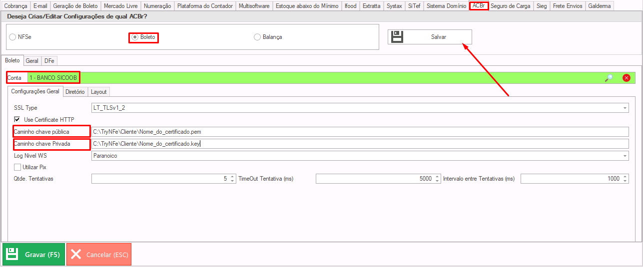 Agora dentro do sistema acesse em Configurações > Configurações Adicionais > Aba ACBr, selecione a opção Boleto e selecione a conta do banco Sicoob cadastrada no sistema e nos campos Caminho chave pública e Caminho chave Privada informe o caminho da pasta onde salvou os arquivos baixados: