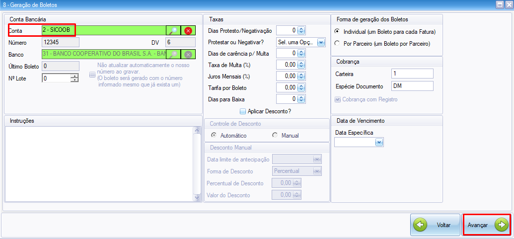Descrição: poderá colocar a forma que quiser na descrição, exemplo: boletos sicoob.