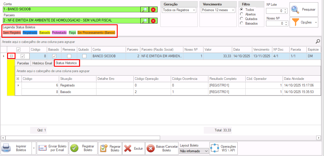 Se você não conseguir imprimir o boleto, será necessário verificar se houve algum erro ou problema no registro do boleto, pois o Banco Sicoob só permite imprimir o boleto após o mesmo ter sido registrado. Para conferir os boletos acesse o menu Banco > Consulta de Boletos, nessa tela é possível verificar se o boleto esta sem registro, registrado ou baixado, conforme a sua legenda de cores, para ter mais detalhes sobre o histórico do registro, basta clicar no mais na frente do boleto e será exibido a aba Status Histórico os consegue verificar os detalhes desse boleto: