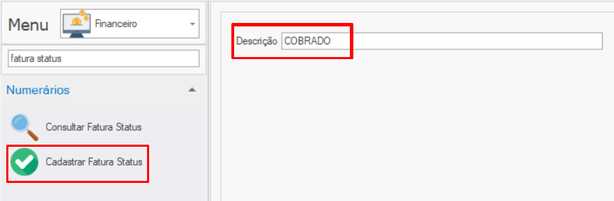 Ao exibir a tela, pode digitar na barra de pesquisa Cadastrar Fatura Status.