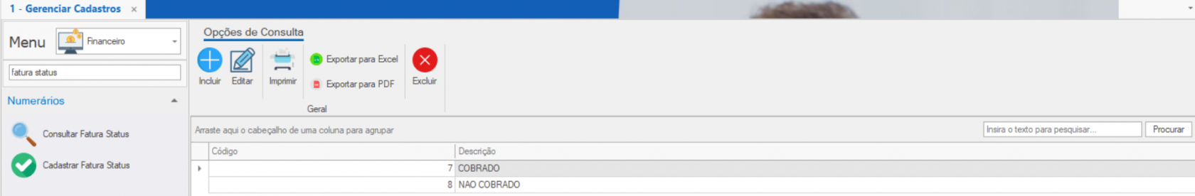 Ao clicar na opção e exibir a tela, e clicar sobre a opção Consultar Fatura Status, irá abrir a tela abaixo, onde você poderá ver todas os cadastros já realizados, poderá fazer a inclusão de um novo registro, edição do registro já existente, exclusão ou importar um relatório destes registros.
