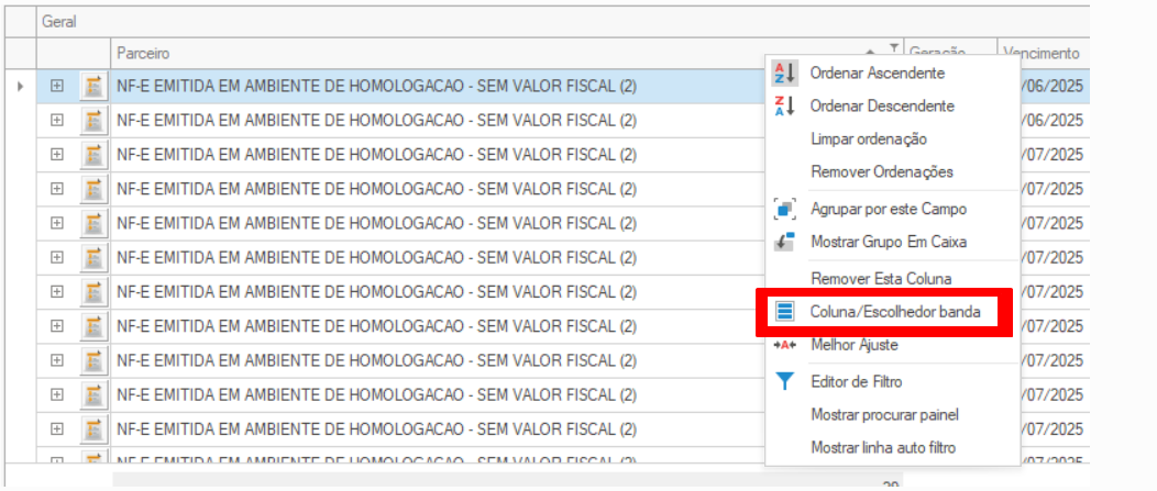 Clicando na opção Coluna / Escolhedor Banda, irá exibir uma caixa no qual poderá localizar a coluna chamada Status, localizando ela, pode arrastar para sua grid de informações, onde preferir, por exemplo ao lado da coluna Parceiro.