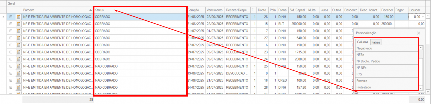 Feito isso, basta somente você clicar sobre o campo status de cada parceiro e selecionar se o status dessas faturas estão ou não cobradas, conforme o exemplo da imagem.