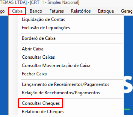 Primeiramente, iremos no menu Caixa / Consultar Cheques, conforme orientação na imagem abaixo: