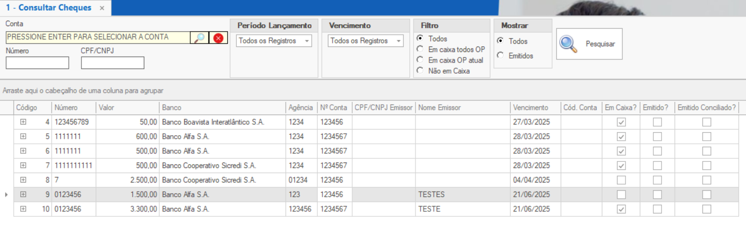 Conta: É possível estar selecionando a conta bancária que esta vinculada os cheques lançados.