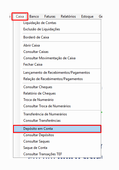 Primeiro passo, será preciso acessar o menu Caixa / Depósito em Conta, conforme imagem demonstrada abaixo.