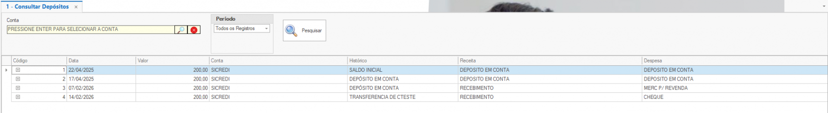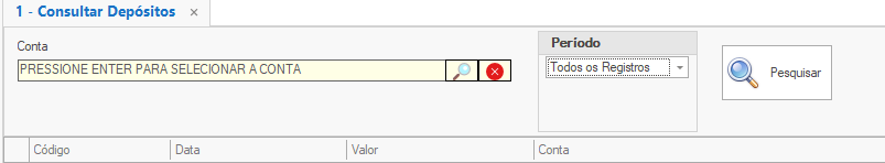 Após isso, você estará com acesso a tela para consultar os depósitos, onde poderá aplicar um filtro para Conta e um filtro para Período, podendo consultar conforme conta desejada e datas desejadas.