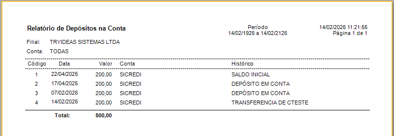 Ao imprimir o relatório de depósitos, ele estará apresentando da seguinte forma:
