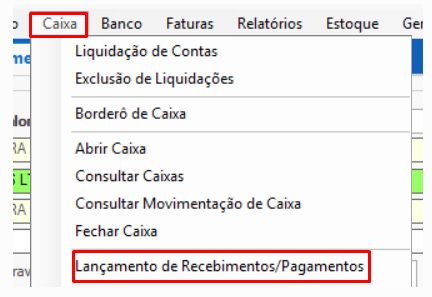 Primeiramente, iremos no menu Caixa / Lançamento de Recebimentos/Pagamentos, conforme orientação na imagem abaixo: