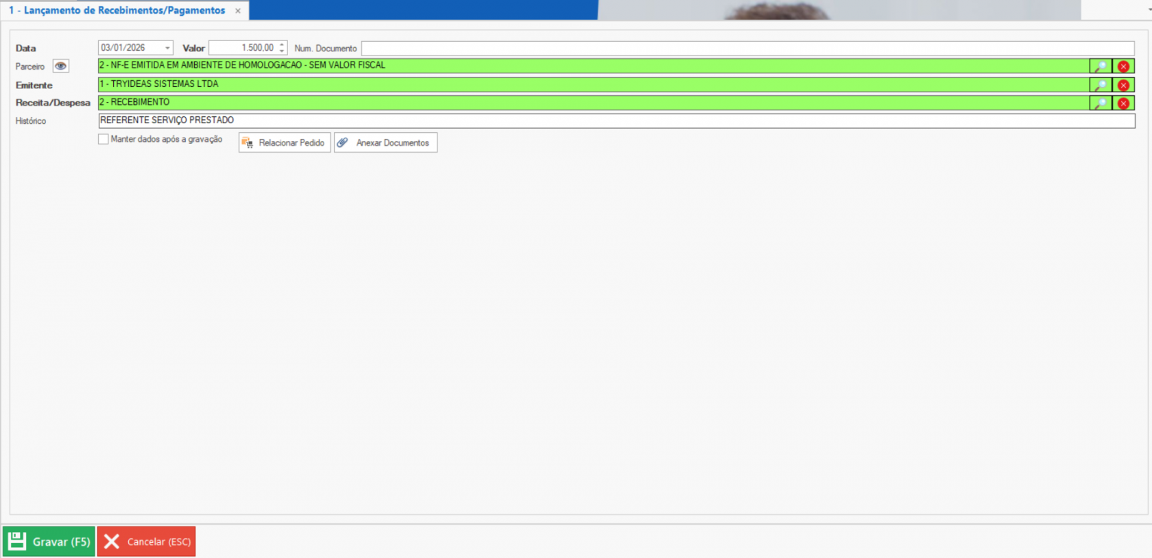 Existe também possibilidade de anexar documentos ou relacionar um pedido ao lançamento.