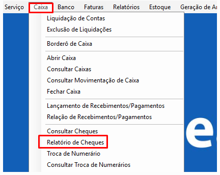 Primeiramente, iremos no menu Caixa / Relatório de Cheques, conforme orientação na imagem abaixo: