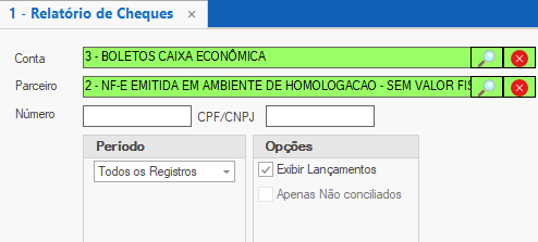 Na tela de relatórios de cheque, ao preencher com as informações precisas para o relatório, ficará dessa forma. No caso de exemplo foi marcada opção de exibir os lançamentos.