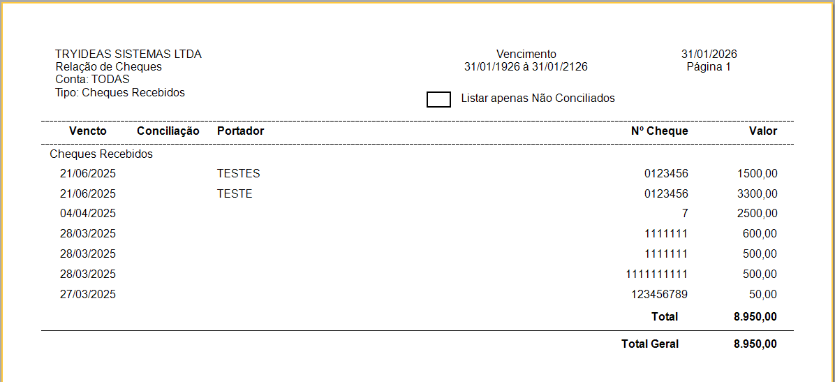 Para gerar o relatório, basta clicar na opção de imprimir, depois de selecionar o tipo dos cheques. Feito isso, ele irá aparecer o relatório, conforme imagem abaixo.