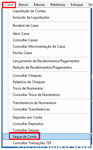 Para chegarmos a tela de saque de conta, vamos utilizar o caminho Caixa \ Saque de Conta, conforme imagem ilustrada abaixo.