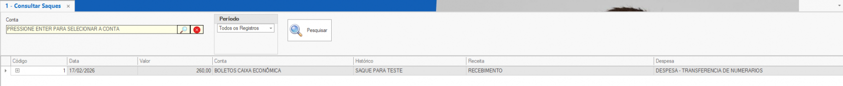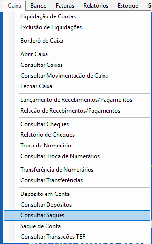 Para chegarmos a tela de consulta de saques, vamos utilizar o caminho Caixa \ Consultar Saques, conforme imagem ilustrada abaixo.