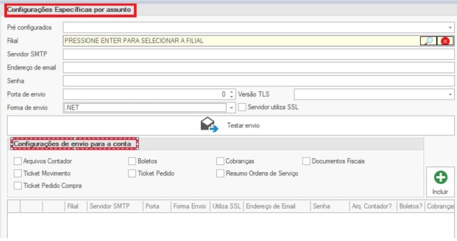 Esta é a parte central das "Configurações Específicas por Assunto". O objetivo é definir quais documentos do sistema (e-mails) utilizarão as credenciais SMTP configuradas acima, e depois salvar essa regra.