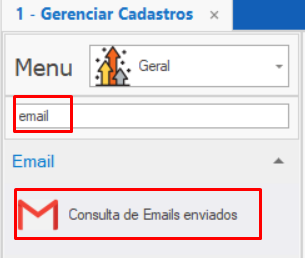 Para acessar a tela de consulta, você precisará ir no menu Cadastros / Gerenciar Cadastros e na barra de pesquisa informar a palavra Email.