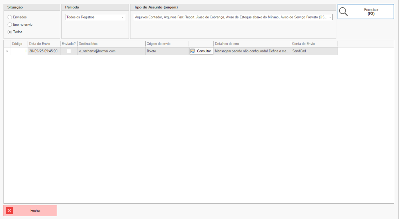 Situação: Definir se quer que seja filtrado e-mails enviados, erro no envio ou todos.