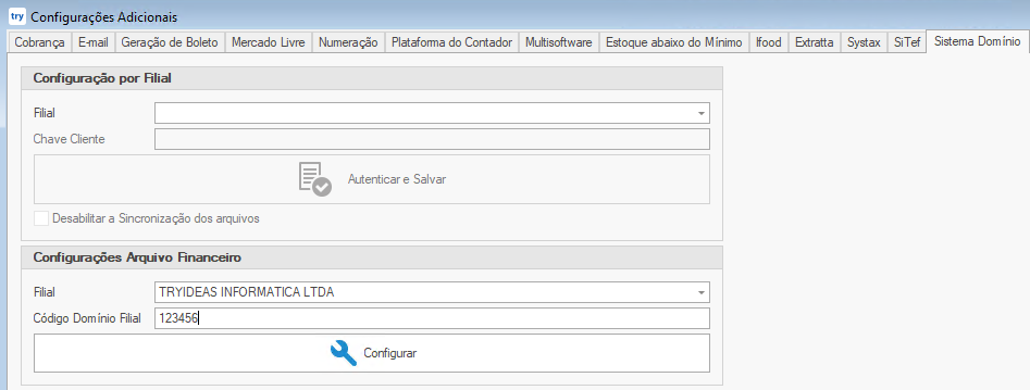 🔧 Configuração por filial: Menu superior Configurações → Configurações Adicionais → aba Sistema Domínio: