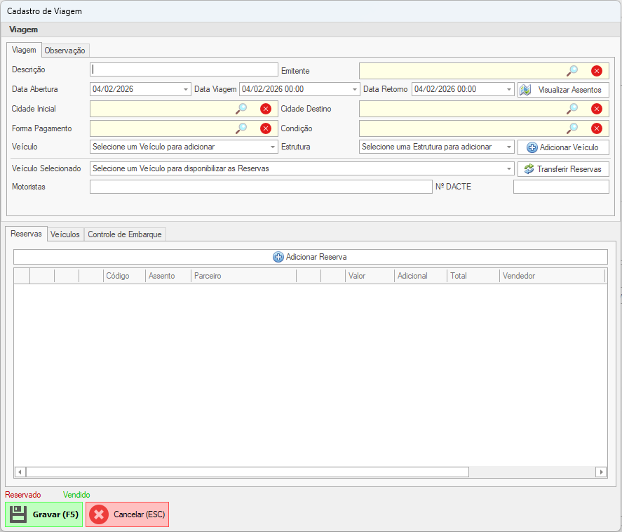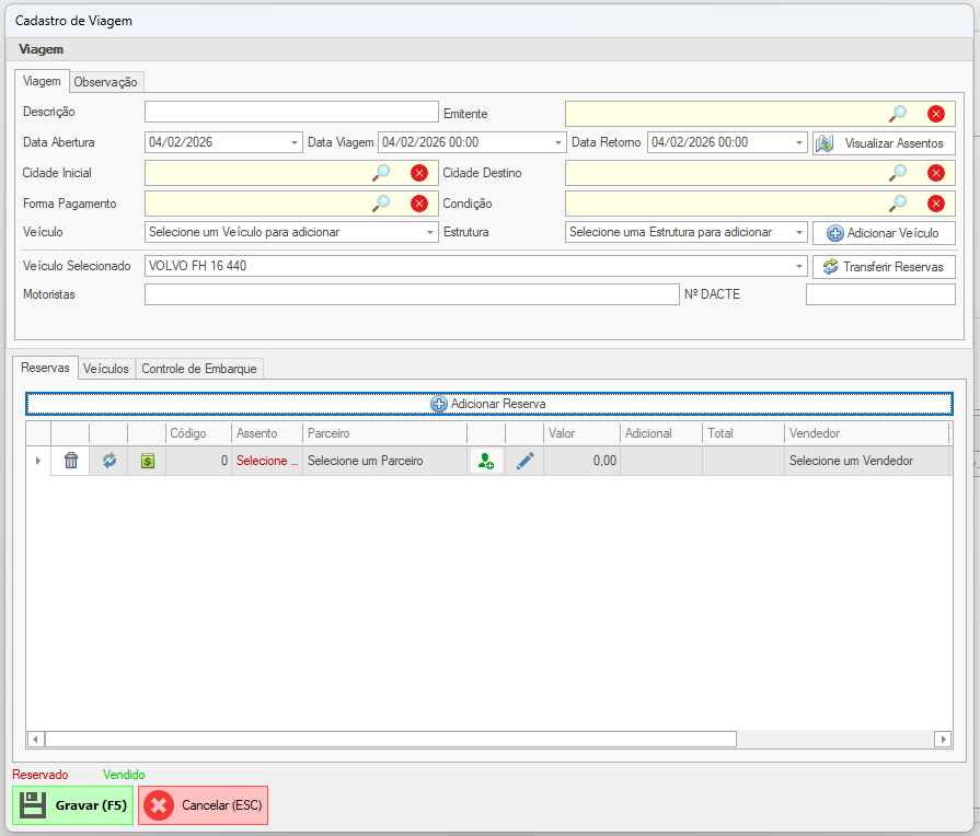 A aba Reservas é utilizada para controlar as reservas de assentos da viagem.