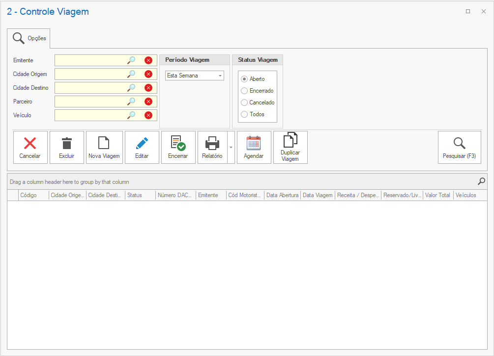 As operações abaixo dependem de uma viagem selecionada no grid (quando aplicável).