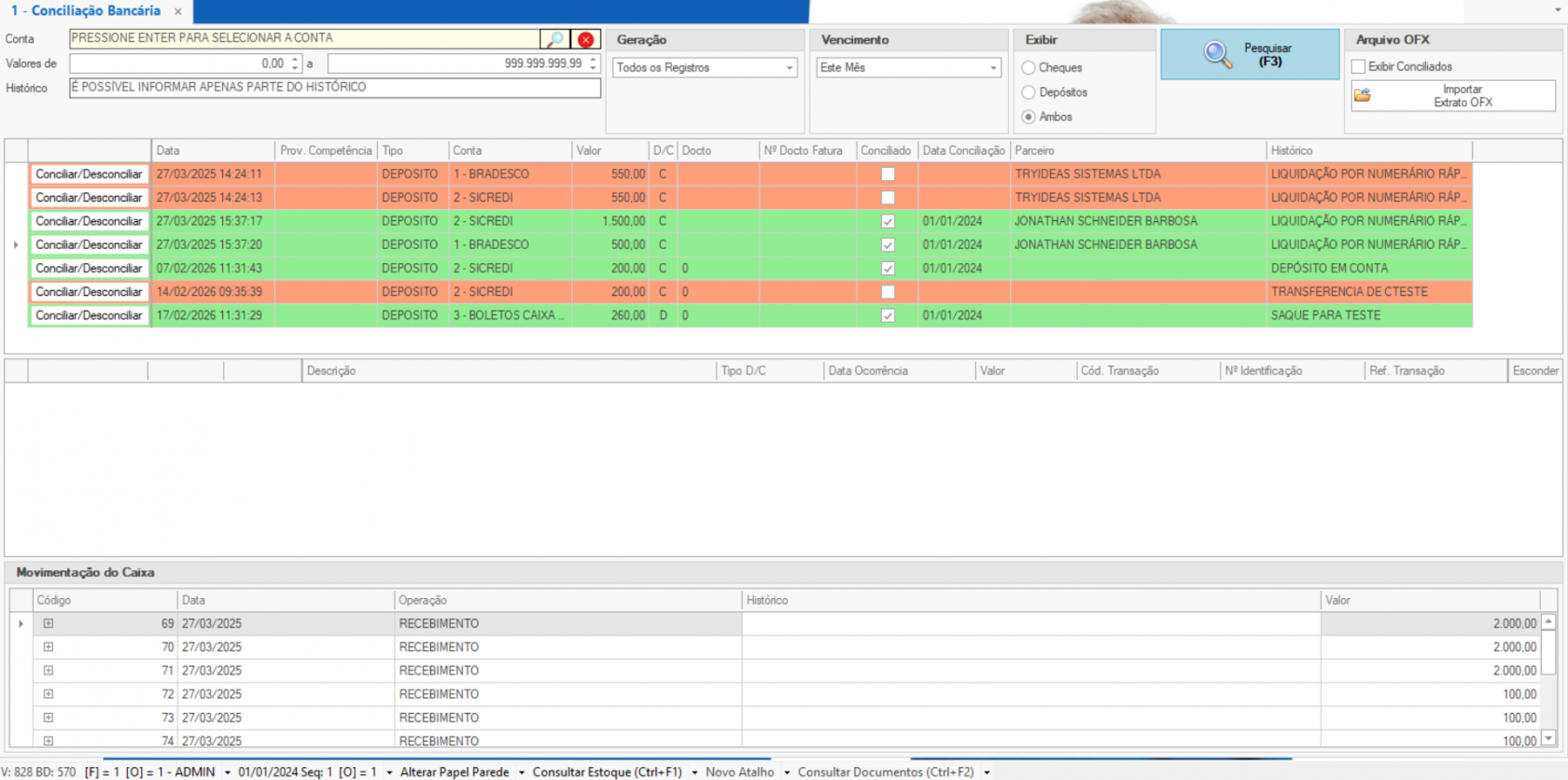 Na tela ilustrada acima, quando lançamentos estiverem em cor Verde vão ser lançamentos conciliados já e quando estiverem em cor Vermelho vão estar ainda com pendência de conciliação.