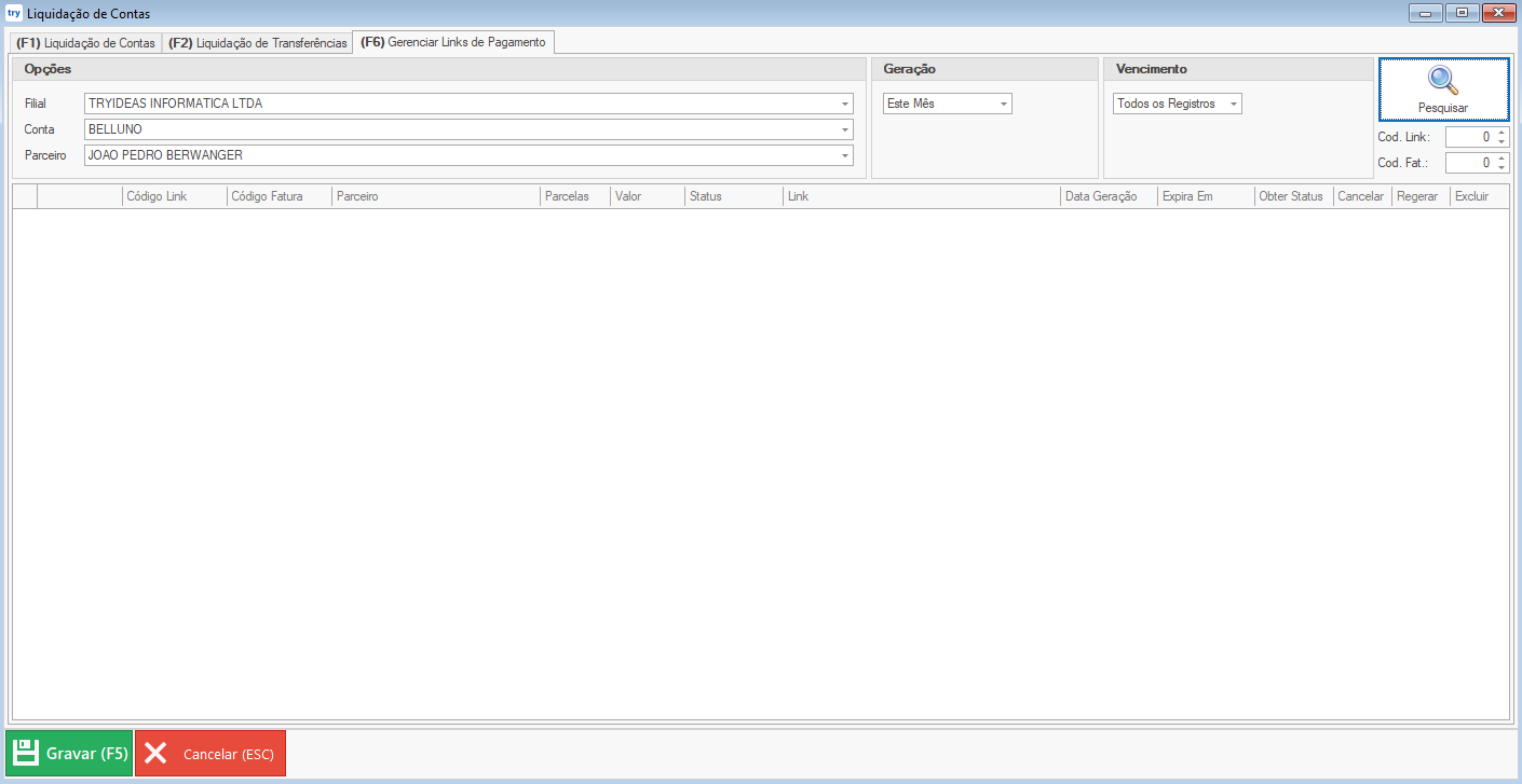 Após gerados, os links ficam disponíveis para consulta na terceira aba da tela de Liquidação de Contas: