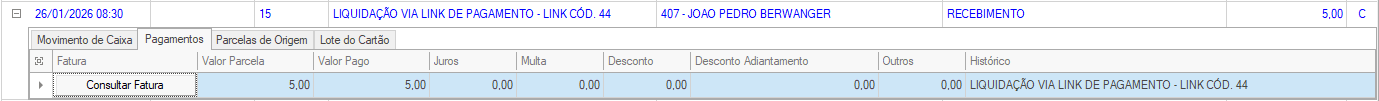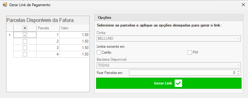 Após a gravação da fatura, o sistema abrirá automaticamente a tela de geração do Link de Pagamento;