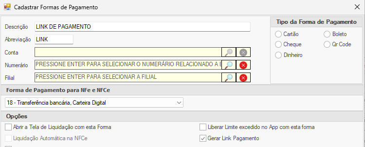 É altamente recomendado configurar uma forma de pagamento com o indicativo de: “Permite gerar Link de Pagamento”. Essa configuração:
