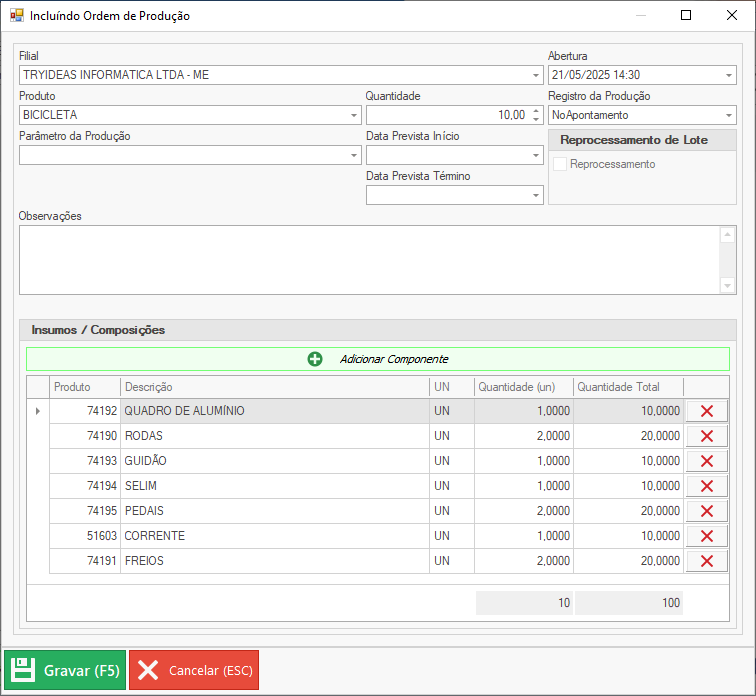 No exemplo da OP para 10 bicicletas, ao clicar em "Iniciar Produção", o sistema irá registrar o horário exato da ação (por exemplo, 21/05/2025 às 15:50) como o início oficial da produção.