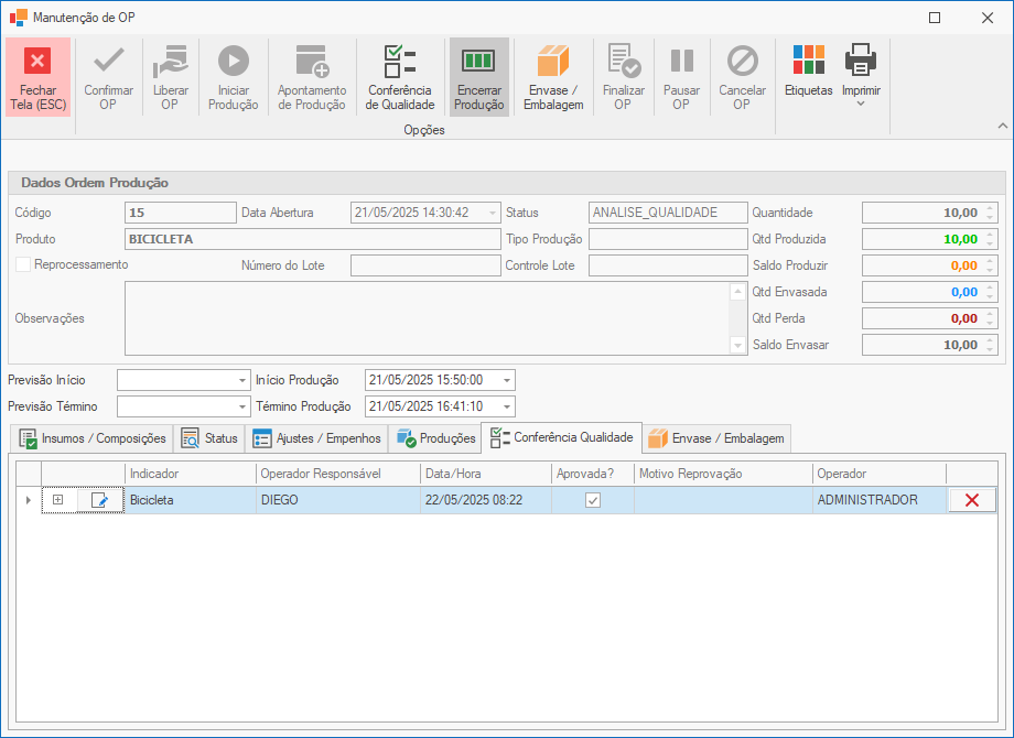 Após a realização do apontamento de produção e a conferência de qualidade aprovada, a OP está pronta para ser encerrada. Esta ação altera o status da OP, impedindo novas alterações.