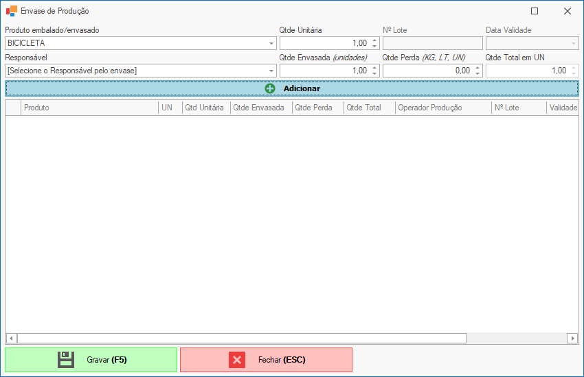Nesse cenário, o operador poderá registrar 20 unidades de galão de 5L, selecionando o produto “Galão de Detergente 5L” como item envasado, com a quantidade de 20 unidades.