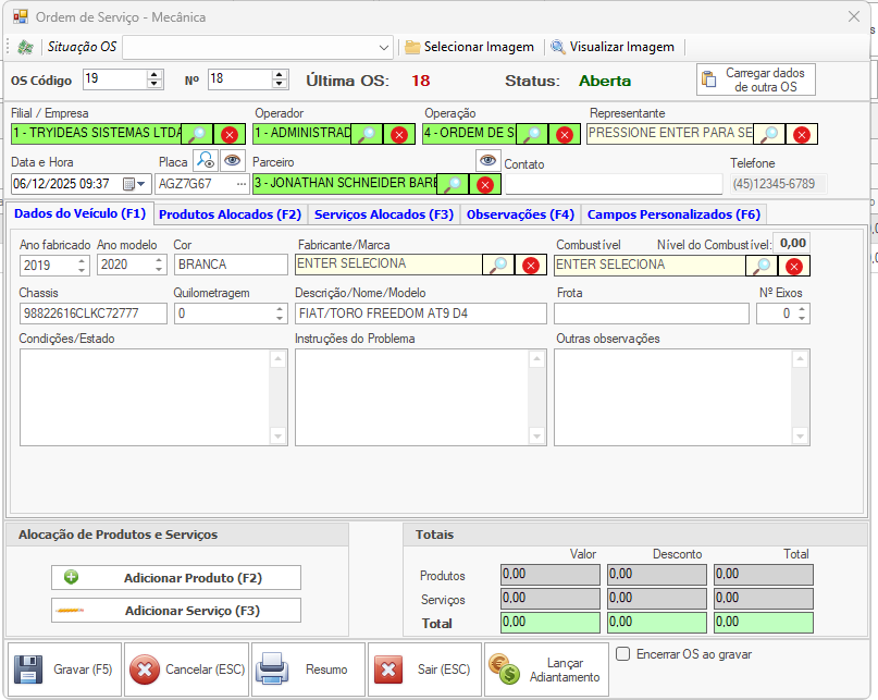 1.1 Dados do Veículo: Permite que você faça alterações em dados de veículos, que possa estar com algum erro de informação ou divergência. Após alterações, basta gravar que a OS estará atualizada.