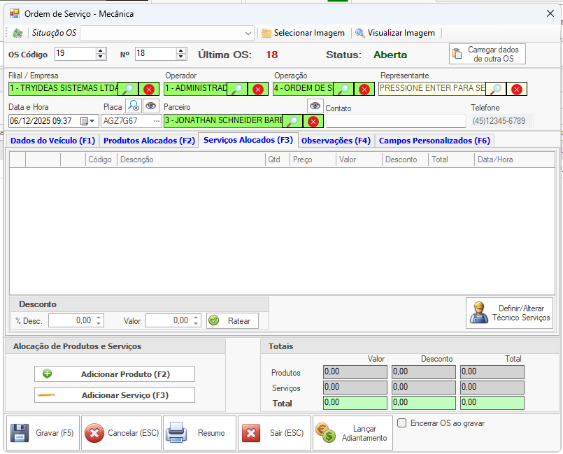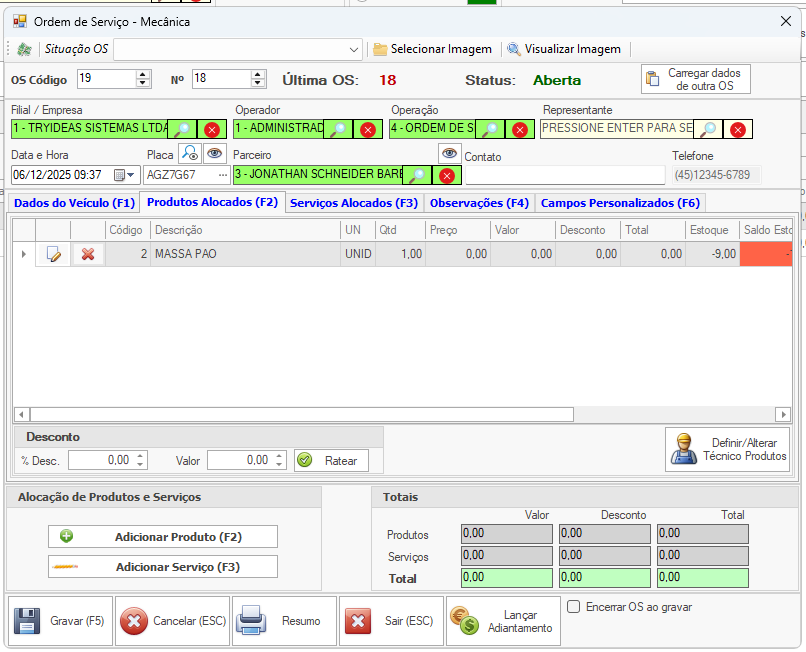 1.2 Produtos Alocados: Permite que faça alterações ou ajustes nos produtos que adicionou na ordem de serviço. Desde excluir ele ou alterar valores, quantidade, etc.