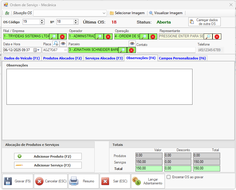 1.4 Observações: Permite incluir observações ou dados que necessitam ter nos dados adicionais da OS, caso desejado.