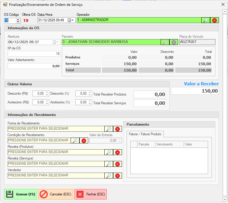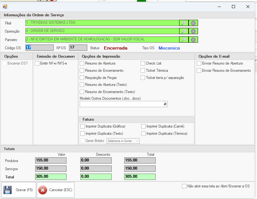2. Encerrar: Permite que você esteja encerrando a OS para poder fazer as liquidações, emissão de notas fiscais, etc. Ao informar as informações de recebimento, irá aparecer uma tela de informações de Ordem de Serviço, nela pode definir para emitir NFe/NFSe ou impressão dos resumos também.