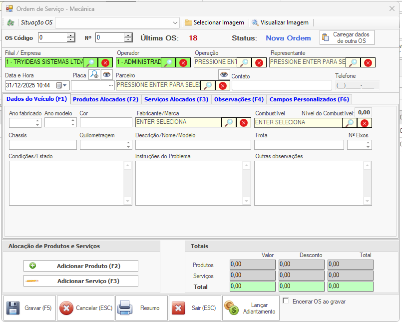12. Nova Ordem: Pode estar utilizando a opção, para gerar uma nova ordem de serviço na tela. A tela a ser exibida será semelhante a tela aberta em ver e editar, a única diferença é que aqui estará abrindo uma nova ordem de serviço para poder incluir dados de veículos, serviços, produtos, observações, etc.