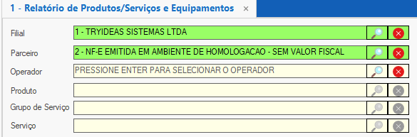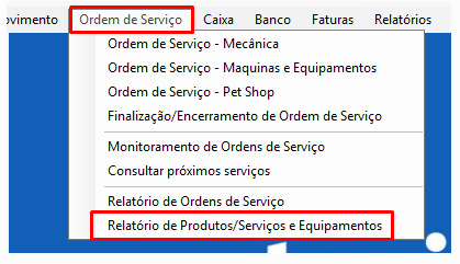 Para estar gerando um relatório de Produtos, Serviços e Equipamentos de uma OS, você pode estar acessando o menu Ordem de Serviço / Relatório de Produtos/Serviços e Equipamentos,