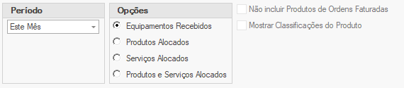 Período, sempre irá preencher conforme a necessidade. Nas opções, pode estar destacando Equipamentos Recebidos, Produtos Alocados, Serviços Alocados ou Produto e Serviços Alocados. Status pode estar selecionando somente abertas ou somente encerradas ou também todos os status.