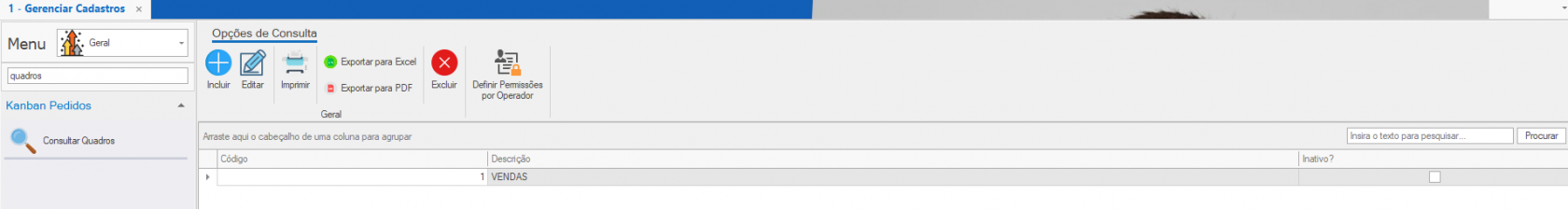 - Inativo -> Selecione esta opção quando desejar inativar o Quadro (nenhum cartão poderá estar vinculado a ele).