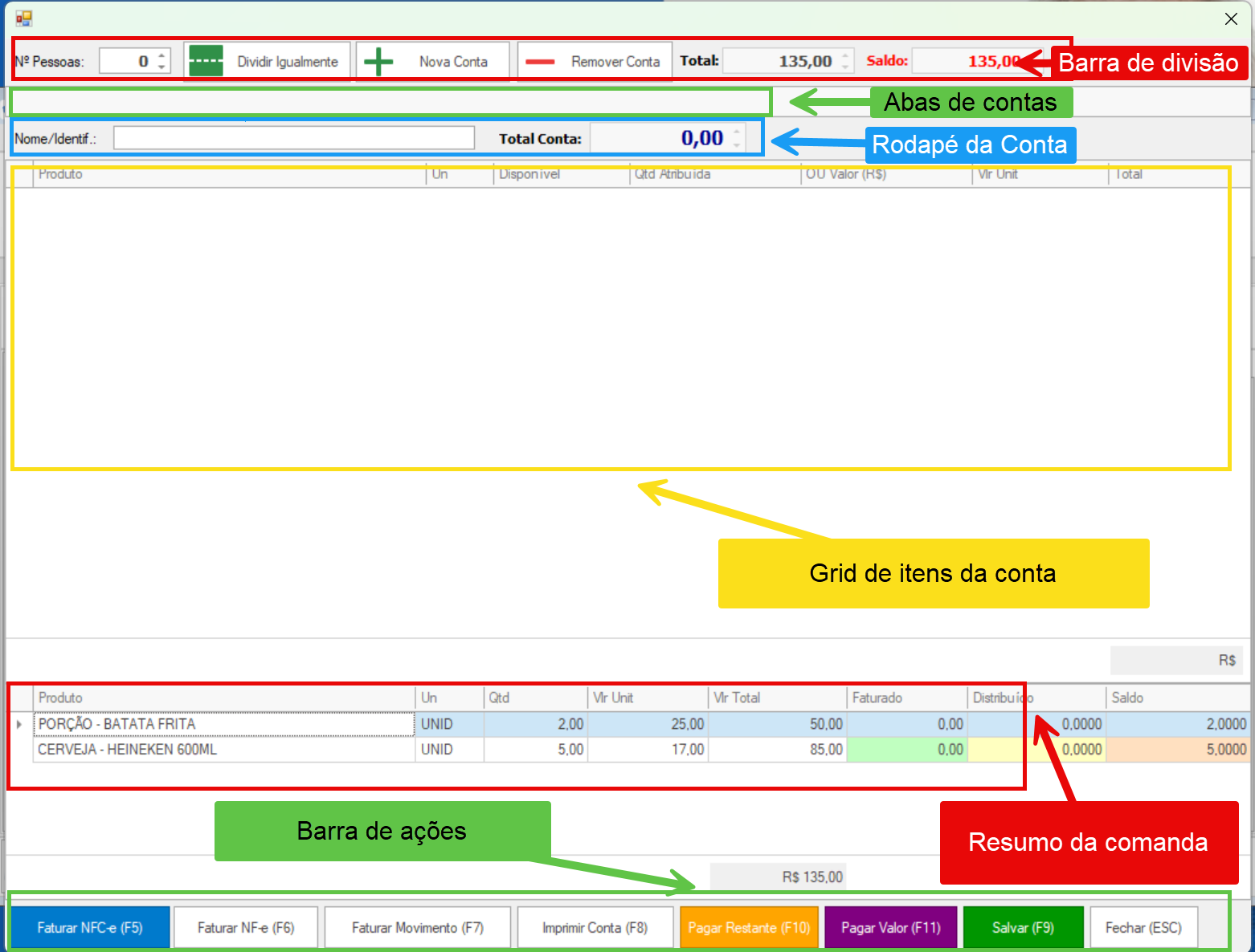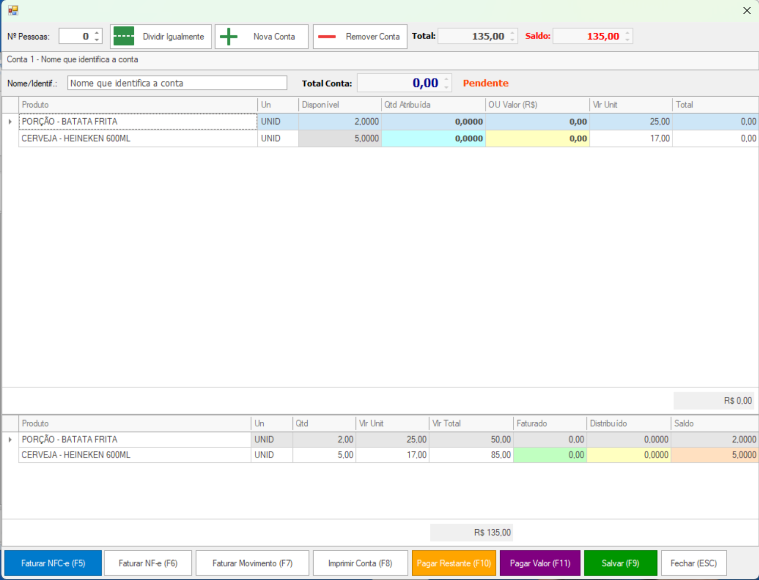 | Grid de Itens da Conta | Centro (expansível) | Lista os produtos com colunas editáveis para atribuir quantidades ou valores |